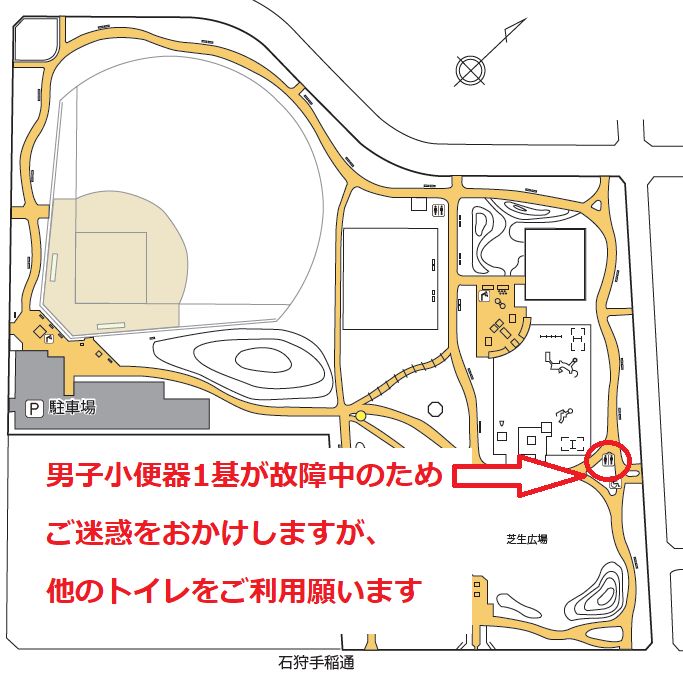 男子小便器故障のお知らせ※11月3日直りました 2021年10月11日2021年11月4日 ※10月11日より使用不可だった下記のトイレが11月3日より使用できるようになりました。 今までご不便をおかけして申し訳ございませんでした。 公園内の公衆トイレの男子小便器が故障のため使用不可となっております。 ご迷惑をおかけしますが、修繕が終了するまで園内の他の公衆トイレをご利用願います。 使用ができない男子トイレは、コンビニのある側の多目的トイレ側横にある公衆トイレとなります。