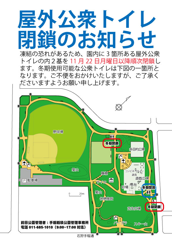 冬期閉鎖施設のお知らせ 2021年11月4日 前田公園内の施設の冬期閉鎖をお知らせいたします。 駐車場は11月30日火曜日が開放最終日です。 12月1日より冬期閉鎖となりますので、ご利用の方は必ず11月30日中に車両をご移動願います。 公園内の公衆トイレは、3基ある内の2基が冬季閉鎖となります。 11月22日以降閉鎖となりますので、トイレのご利用は下図の1基をご利用ください。