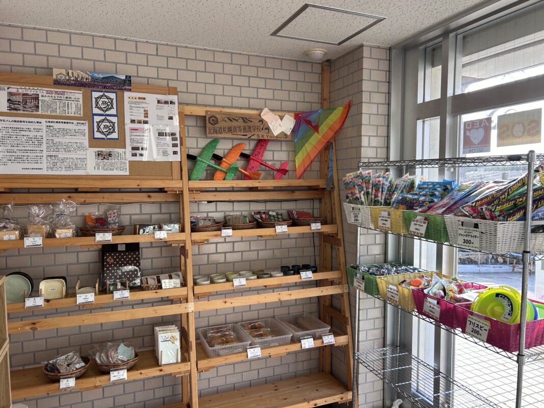 売店では外で遊べるおもちゃ、北海道札幌高等養護学校の生徒さまが作った作品などを販売しております。