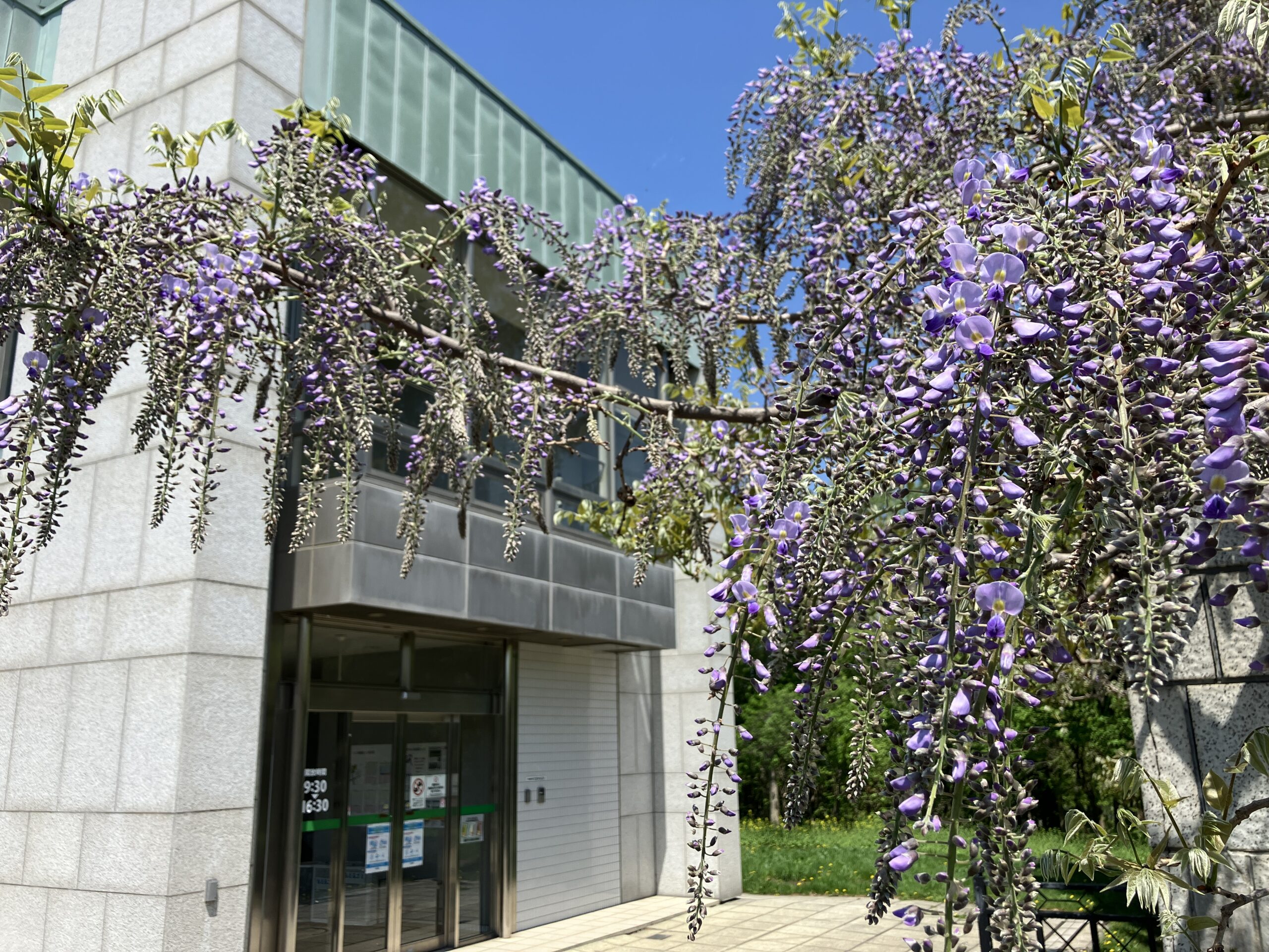 遠目から見るとかなり紫っぽく見えます。大パーゴラの一部分(ピンクっぽい箇所)は満開近くまできていますが全体的な見頃は来週中頃から週末にかけてでしょうか。(参考、昨年度は25日から27日頃までが全体的な見頃)
