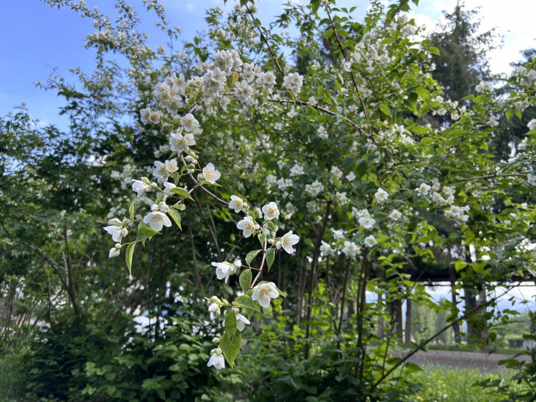 前田森林公園、展望ラウンジ近くではフジの花が注目されていましたが、フジが散って次は近くでバイカウツギがきれいに咲き始めております。 園内はたくさんの花があるので、時期によって咲いているお花も違うので同じ道を散歩しても楽しめるのではないでしょうか。
