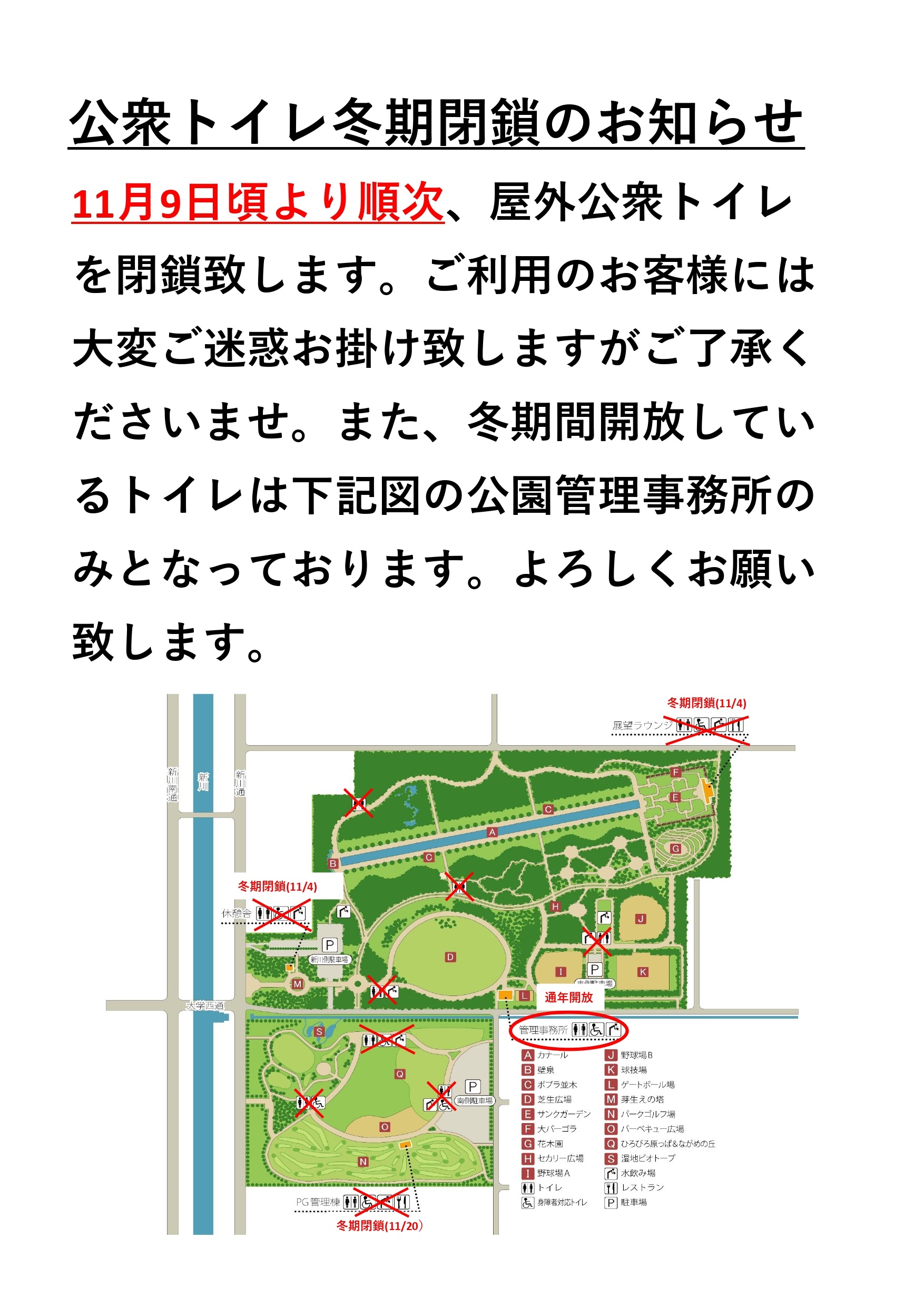 さて、公園内の公衆トイレの閉鎖ですが、 11月9日頃より順次閉鎖を開始致します。