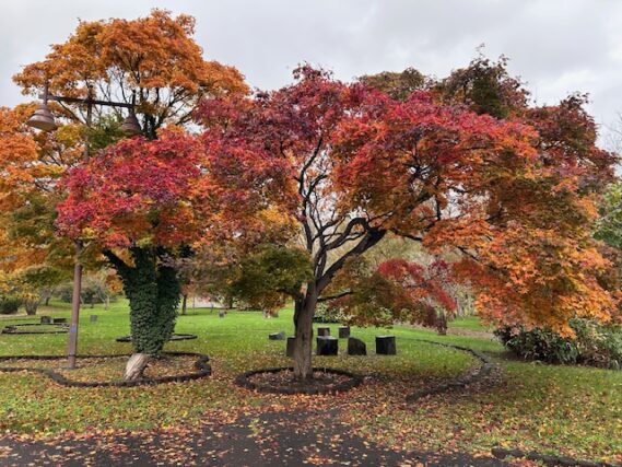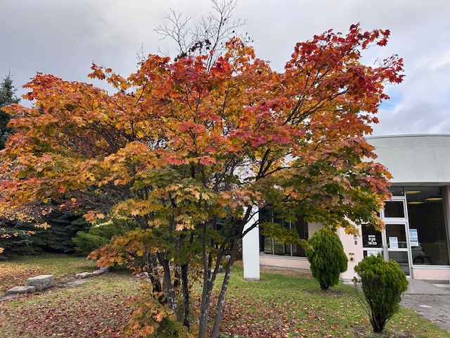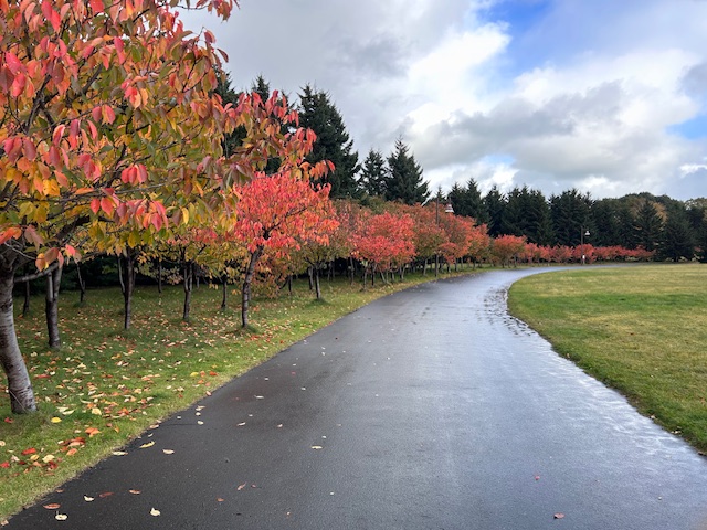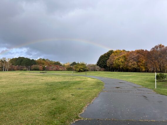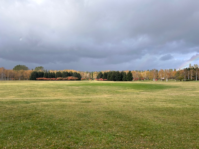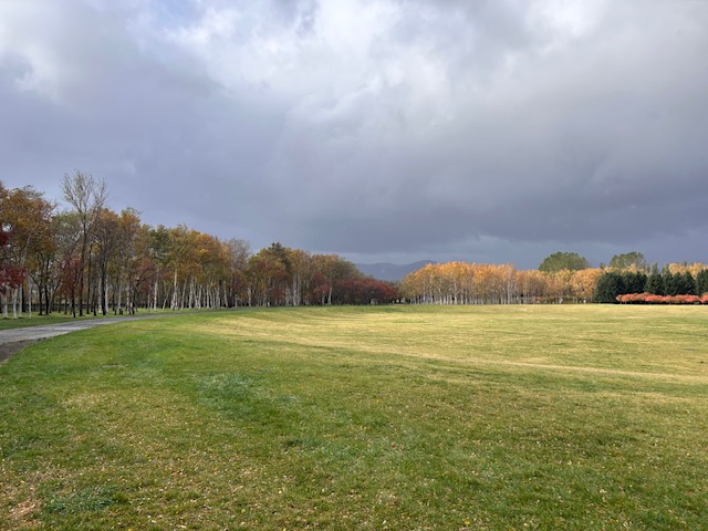 管理事務所前からの景色も樹木の色づきにより秋を感じます。遠くからみると、ふるさとの森シラカバもきれいな黄色に色づいてます。