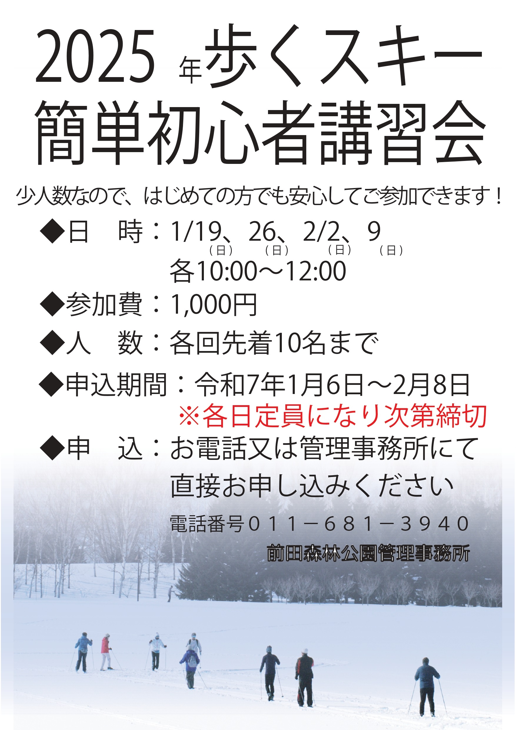 さて、来年の1月19日 1月26日 2月2日 2月9日 計4回 「歩くスキー初心者講習会」を行います。(内容は4回ともほぼ同様の内容となっております