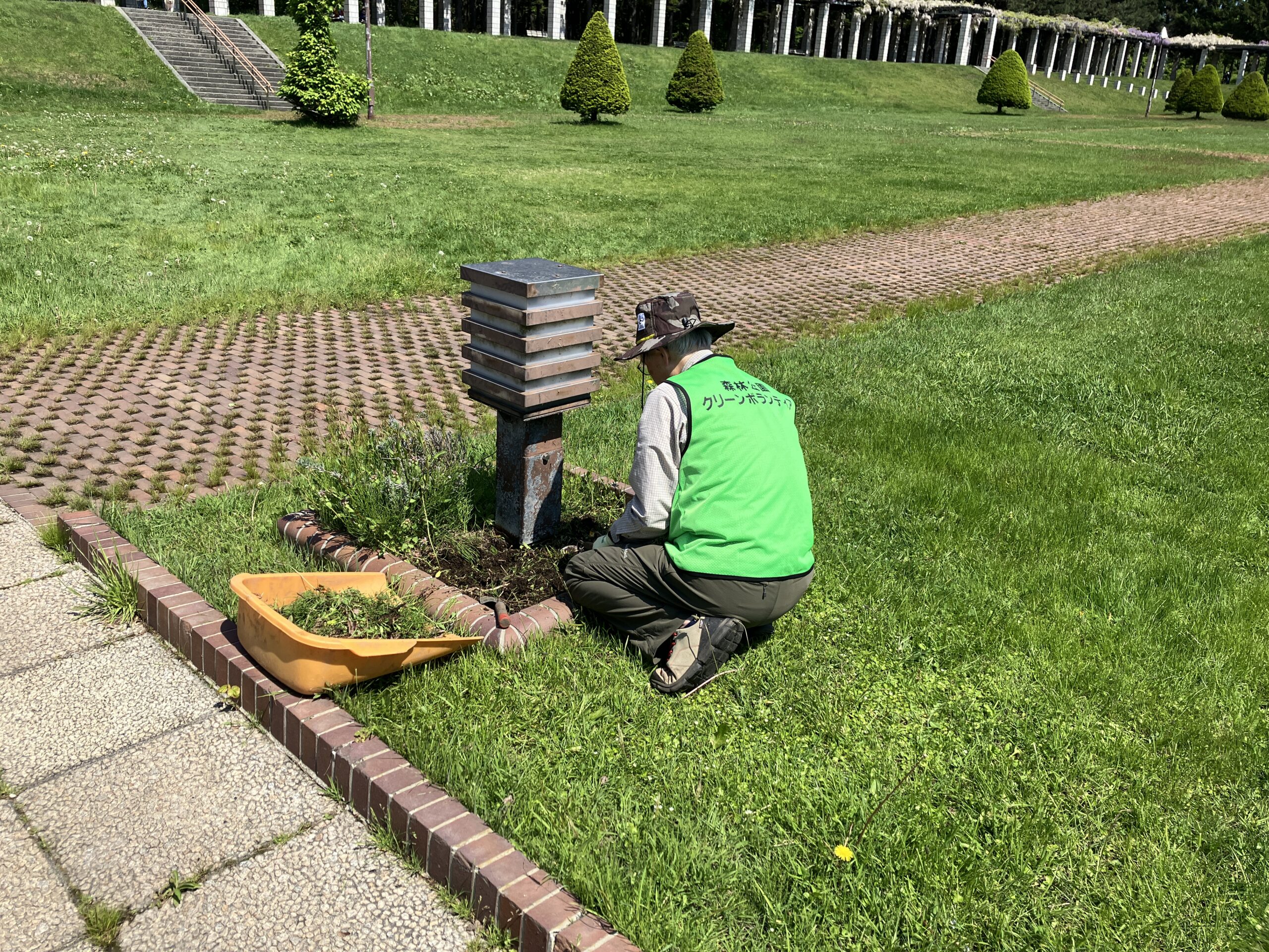 サンクガーデン噴水周りパンジーのお手入れ班とフットライト周りの除草班二手に分かれました。