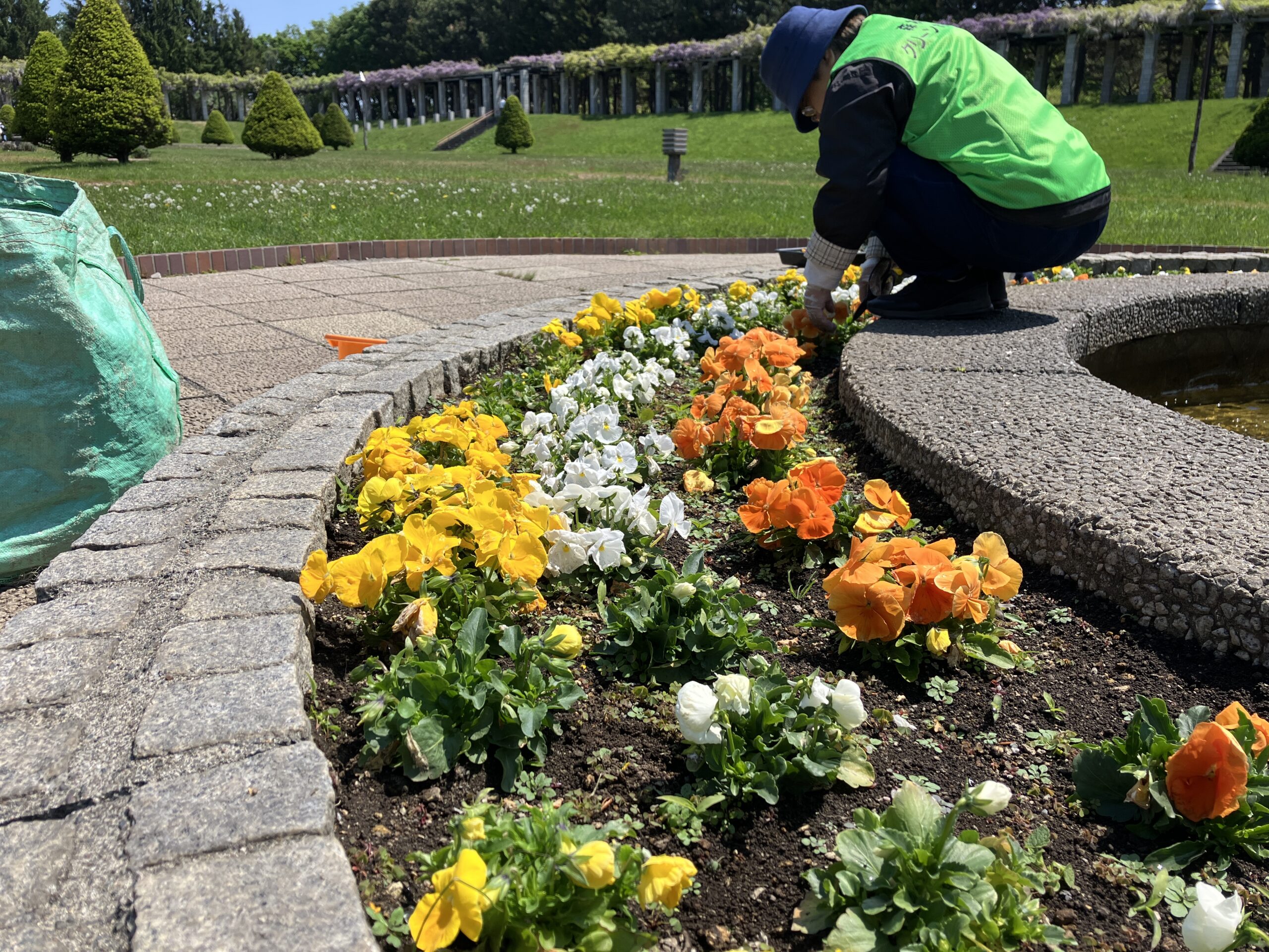 サンクガーデンの春花壇から夏花壇への衣替えです。