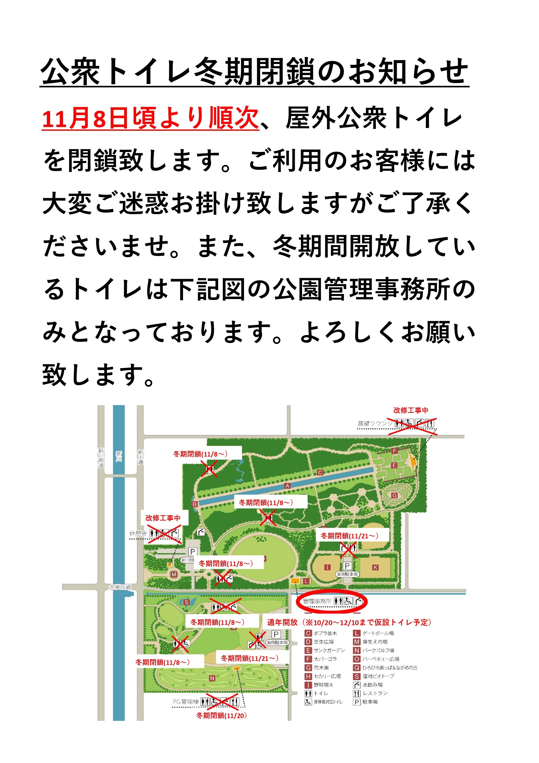 公園内の公衆トイレの閉鎖ですが、 11月8日頃より閉鎖を開始致します。