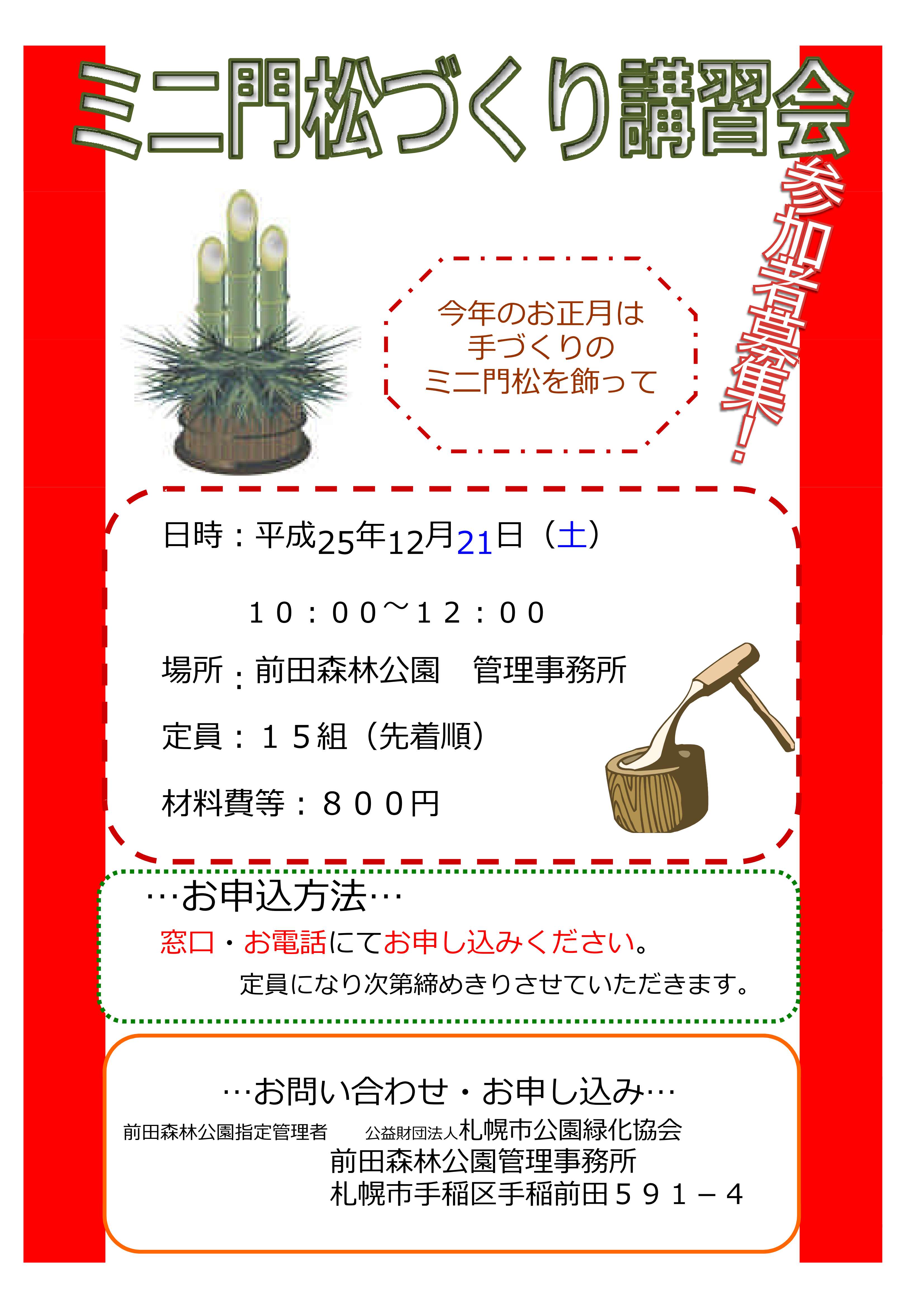 11月も後半に入り、新しい年に向けて何かと忙しくなってくる時期ですね。 前田森林公園では、新年を迎えるための門松作りイベントを開催します。 お子様でも簡単に作れますので、気軽に伝統に触れるクラフトを、お楽しみください。 (西宗)