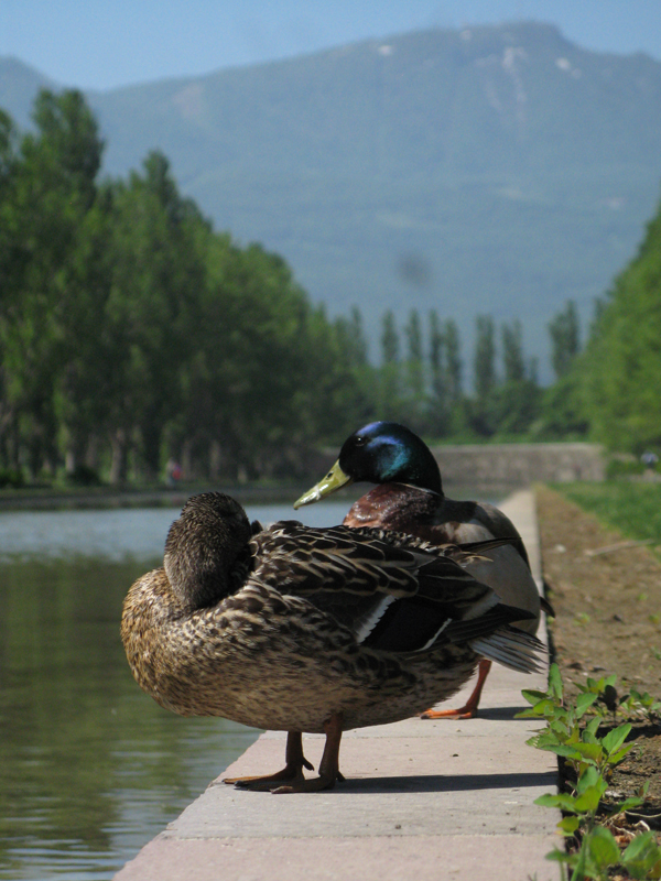 オマケ:手稲山をバックにカモのご夫婦。カナールでひなたぼっことお昼寝中。 (大森)