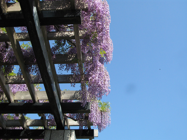 週末頃に満開になりそうです。香りを感じながら下からパーゴラを見上げるのも素敵ですが