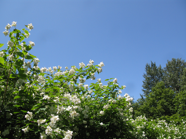 今ラウンジ裏側で盛りの「バイカウツギ」の説明を受けていた時に、カラスアゲハがやって来ました。