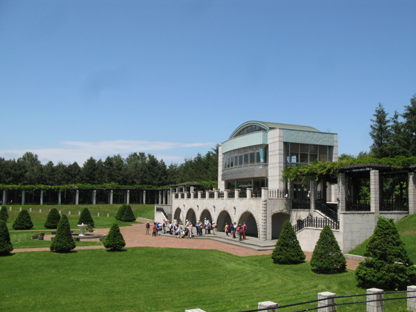 天気が良すぎて、遠くの手稲山が霞んで見えます。ラウンジの藤棚も青々としています。