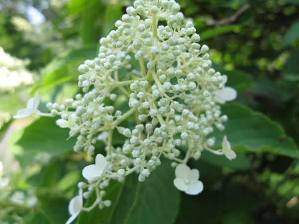 ノリウツギの蕾も開いてきました。花びらのように見えるのは、萼(がく)が変化したものです。