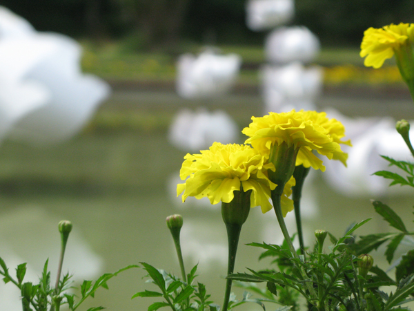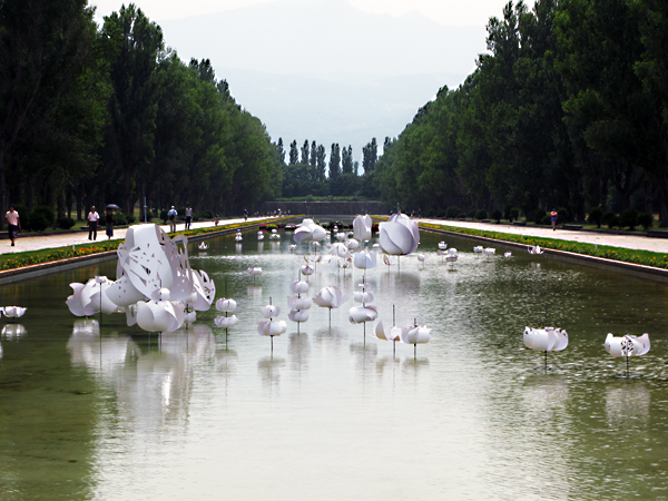 フラワーアートウィークの期間中、カナールに浮かぶ白い大きな花たち。