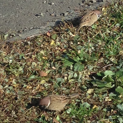 出勤してきまして事務所の駐車場に車を停めたところに、車の外にスズメが降りてきて地面をつつき始めました。