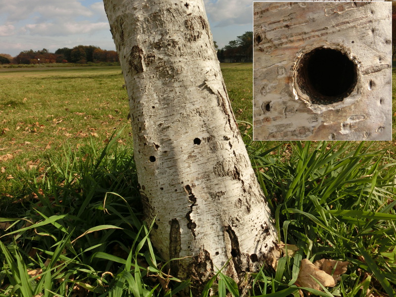 (シラカバナガタマムシという虫も、同じように穴をあけるそうです)
