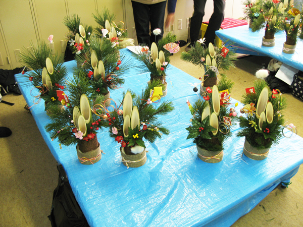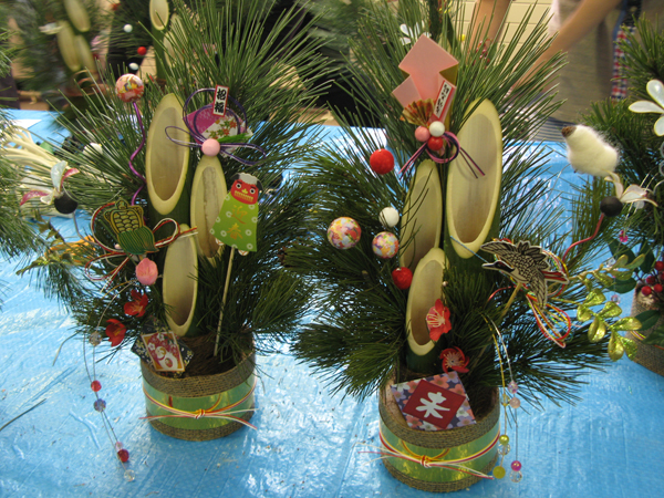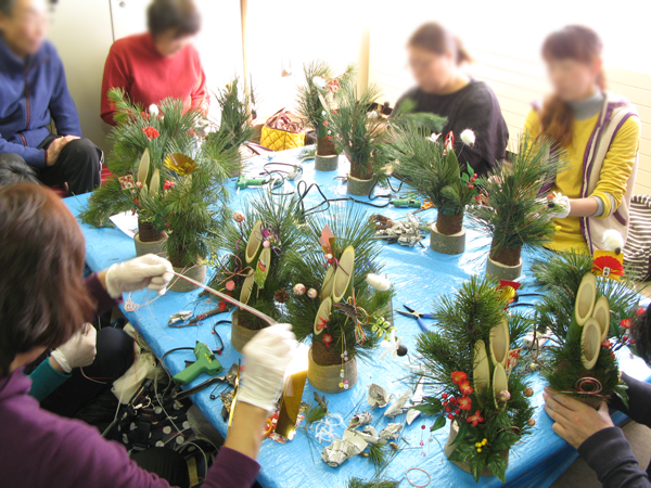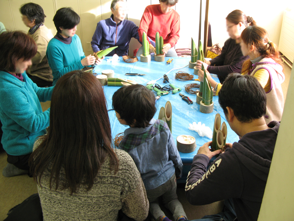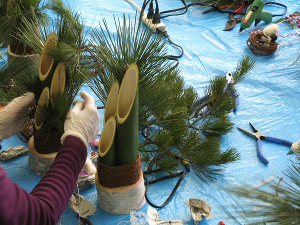 今日は「ミニ門松づくり講習会」の日でした。職員が講師となって、青竹を組み松を飾っていきます。