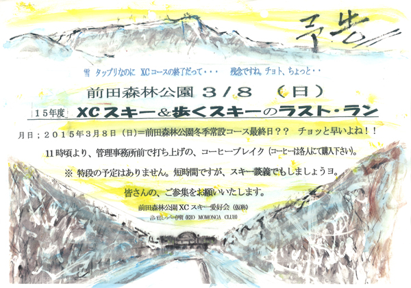 おはようございます。 本日3月8日は、スノーラフティング、スキーレンタルの最終日です。 スキーは、コースの整備も本日で終了なので 愛好家の方達が集まって走りを楽しんだ後コーヒーブレイクをする「ラストラン」があります。 これが、有志の方が作られた予告チラシです。お時間がありましたらお立寄りください。 今日は良い天気になりましたので、最後の冬遊び、ぜひお越しください。 (大森)