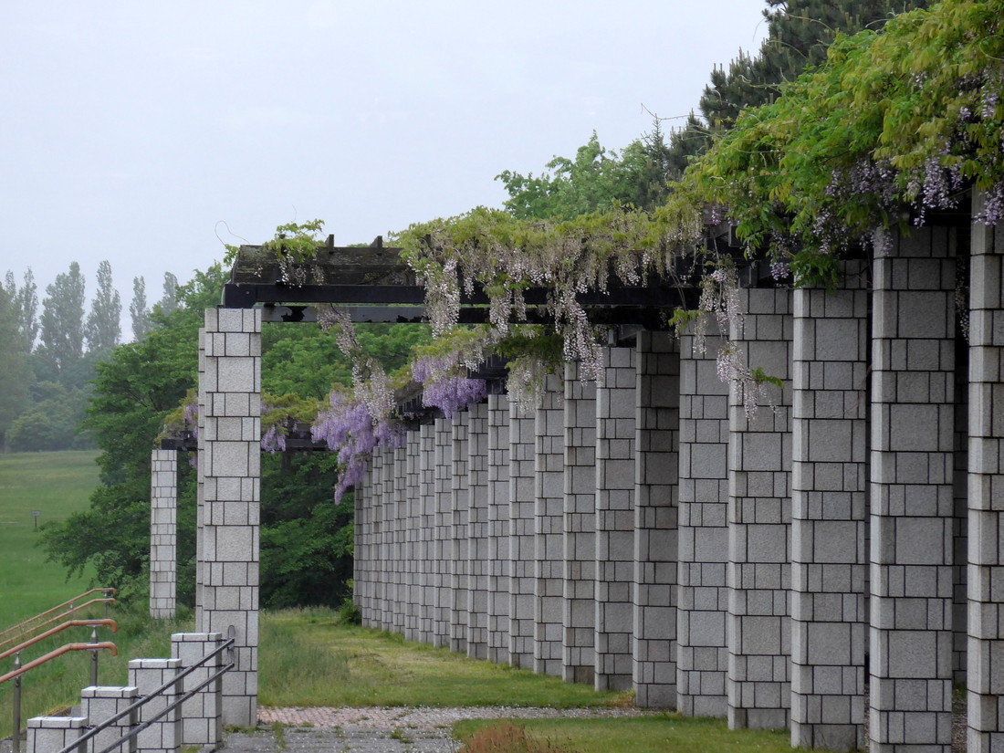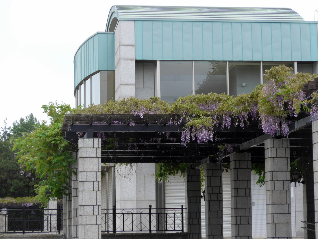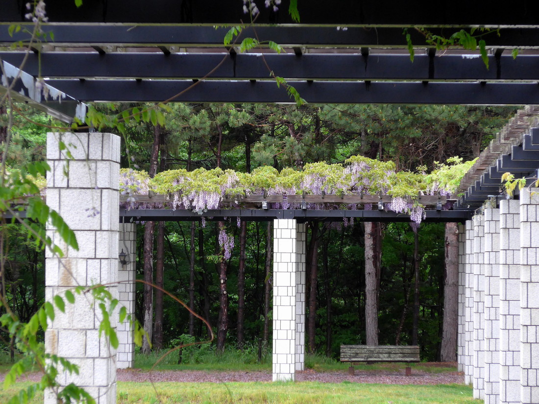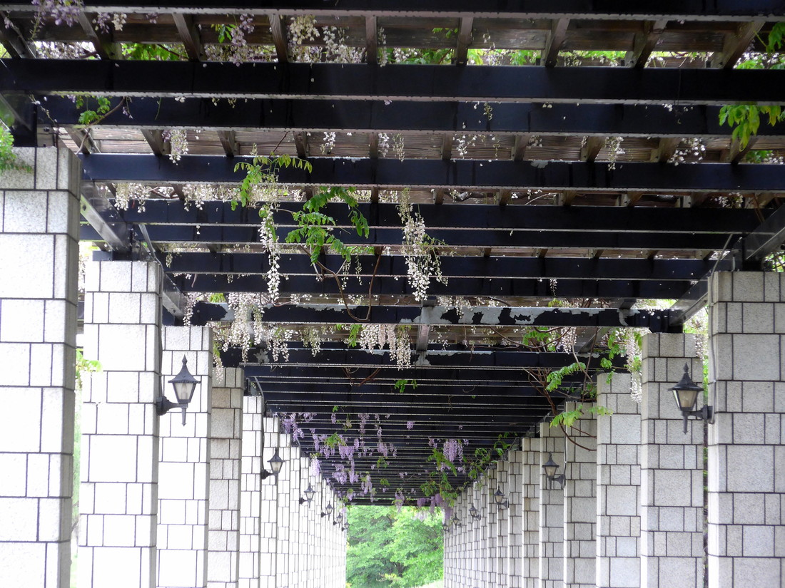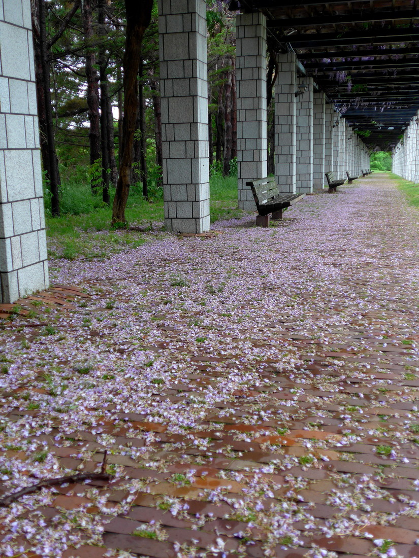 昨日今日のはげしい雨にもマケズ、藤の花頑張って咲き残っております! 藤の様子をご覧ください。 写真にはありませんが、白花の藤がかなり良い状態です。 まだまだ見に来ていただく価値がありますよー! そして足下には 紫色のじゅうたん。 (オオモリ)