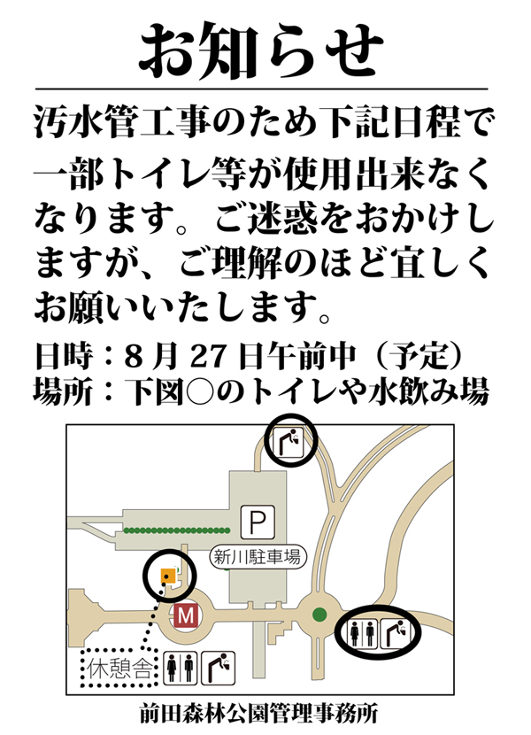 先週から園内では貼り紙でお知らせしておりましたが 明日27日の午前中、園内の汚水管工事を致します。 その影響で、休憩舎のトイレ、カナール側の水飲み場、芝生広場前のトイレの使用が 出来なくなりますのでご注意ください。 ご迷惑をおかけしますが、ご理解のほど宜しくお願い申し上げます。(オオモリ)