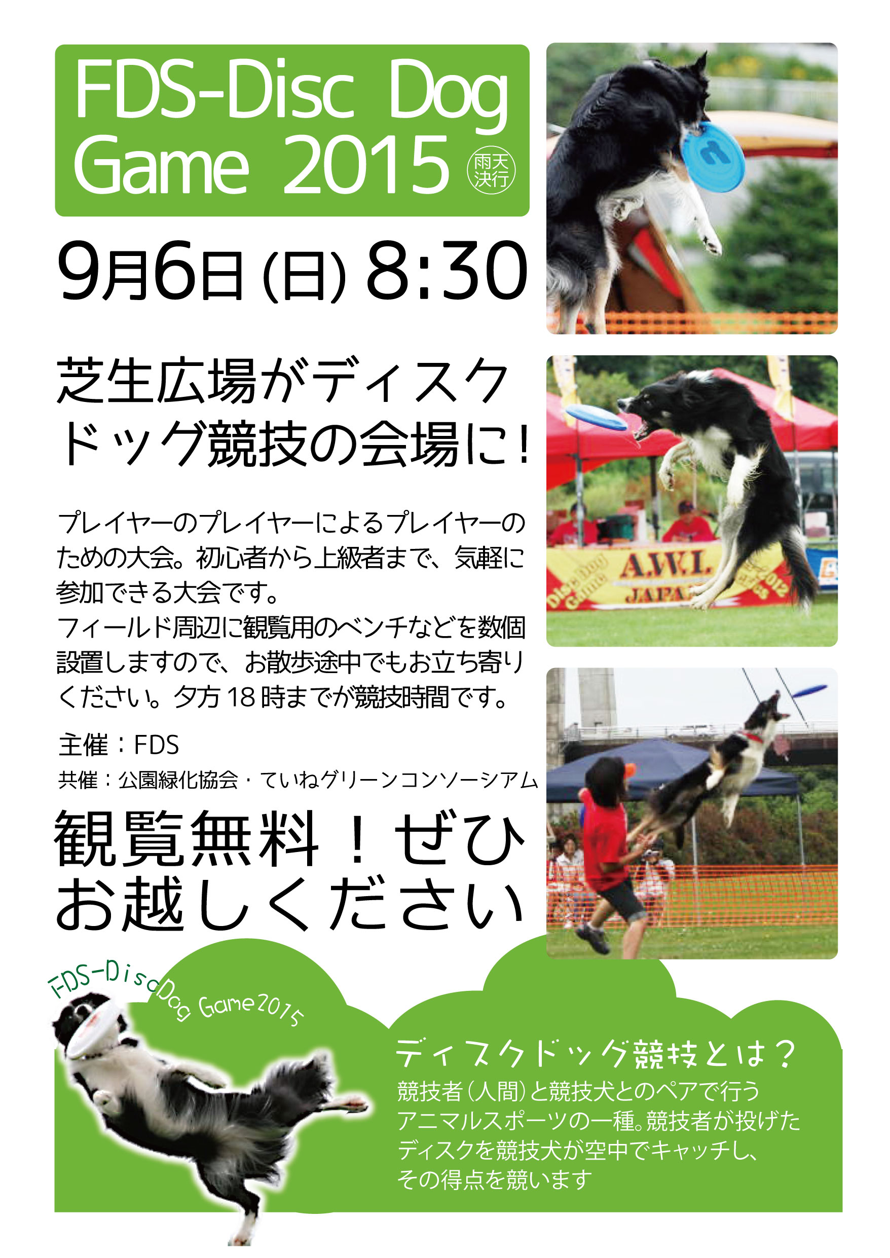 9月6日8:30から、芝生広場にてフライングディスクドッグの大会があります。 事前にエントリーされた犬たちが、音楽に合わせてディスク競技を繰り広げます。 観覧は自由ですので、元気に跳び回る犬と人との妙技をぜひご覧ください