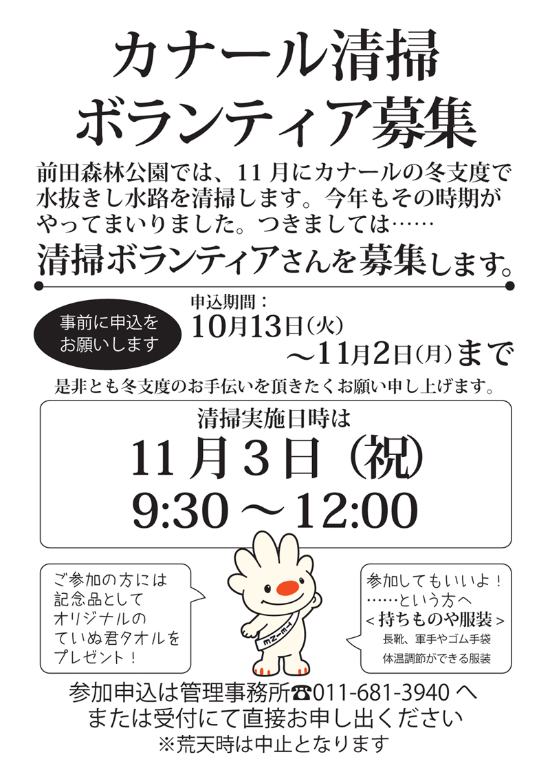 台風一過で後はもう冬への準備に入る季節です。 当園の600mに及ぶカナールも、冬にそなえて水を抜き清掃いたします。 このカナール清掃にボランティアで参加くださる方を募集いたします。 お時間のある方は、ご参加頂けますと誠にありがたいです。 宜しくお願いいたします。 (大森)