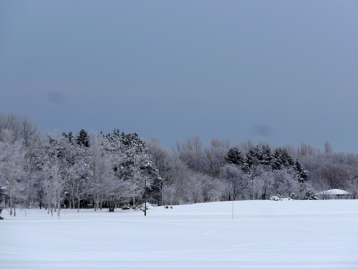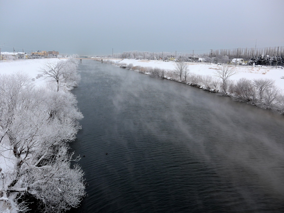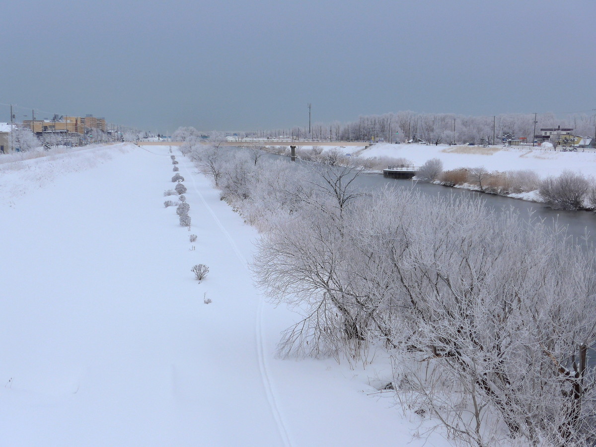 前田森林公園の前に流れている新川の河原も、暗めの空に白い雪が映えています。