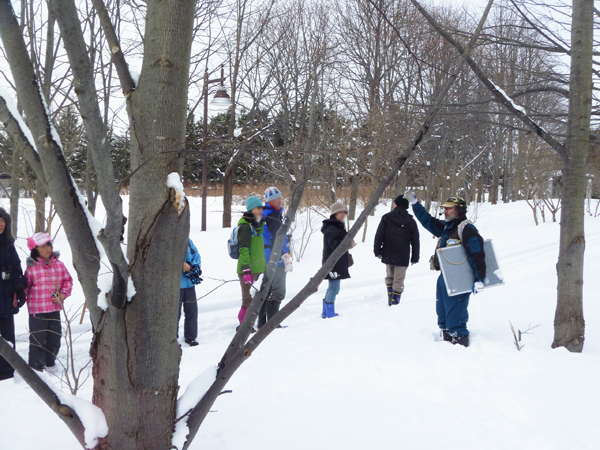 雪上の足跡から動物を知ったり、冬の樹木の芽を見たりと