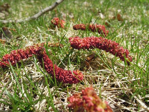 もじゃもじゃの正体は、コレ↑。地面に落ちている赤いケムシみたいなのは、「ポプラの雄花」です。
