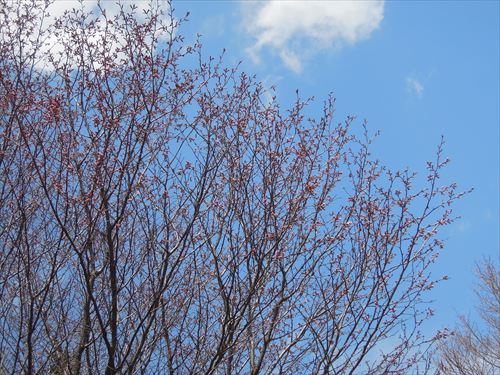 開花はごく一部ですので、遠くから見るとまだつぼみがややピンクに色づいている程度です。