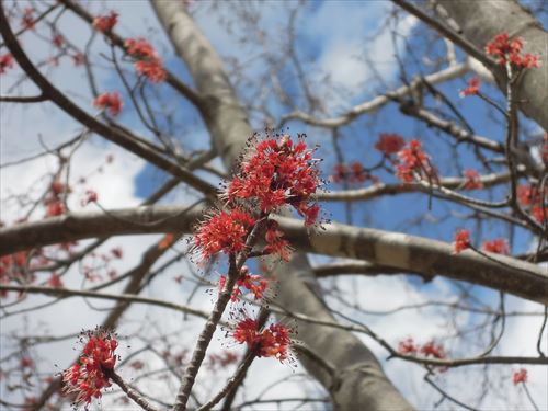 こちら↑が色鮮やかなルブルムカエデの花。別名「アメリカハナノキ」「ベニカエデ」と呼ばれ、春はサクラと同じ頃に咲き、秋には紅葉が美しいカエデです。学名: Acer rubrum