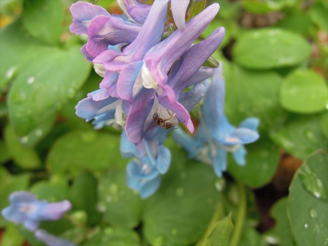 エゾエンゴサク 涼しい場所のはまだ花が残っていました。レインボーな花色のこちら↑には、アリが遊びにきていました。