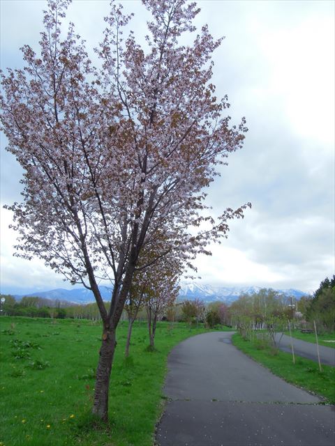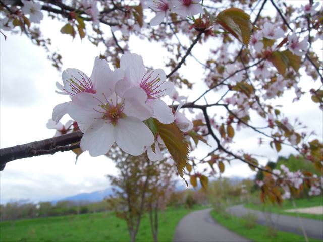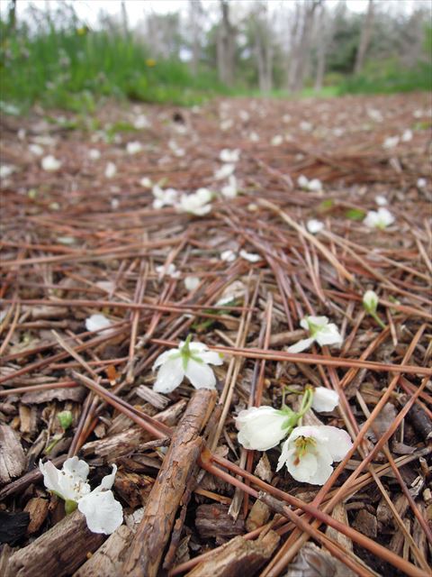 エゾヤマザクラが散り、花びら舞う園内ではスモモの花が咲いています。