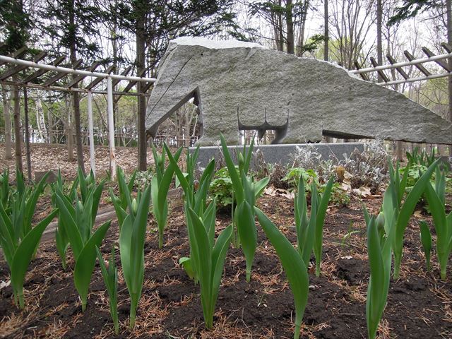 スモモのそばにある「セカリー広場」のチューリップがぐんぐん成長をしてつぼみをつけています。