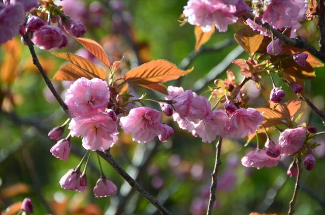 そばにあるピンクの八重桜「関山(かんざん)」は、つぼみが多い状態です。