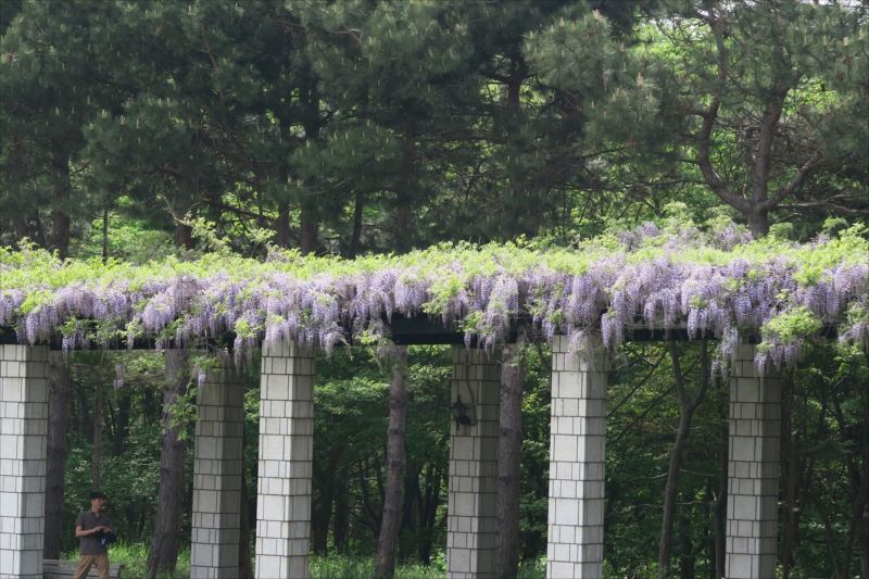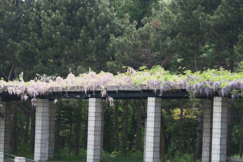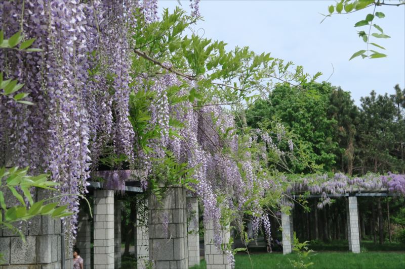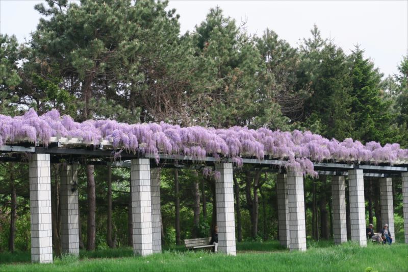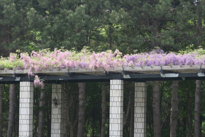 今日のフジは、7~8分咲きです。日当たりの良い場所は満開に近くなっております。日陰は6分咲き程度。 最高の見頃は今週末から6月10日くらいでしょうか。天候に左右されるのであくまでも予想ですが。 ちなみに、6月4日と5日は「ふじまつり」もありますのでぜひお越しください。 それでは、本日撮影したフジたちです。 展望ラウンジ2階から ピンク・紫・白の花色の変化。各々違う品種です。 (オオモリ)