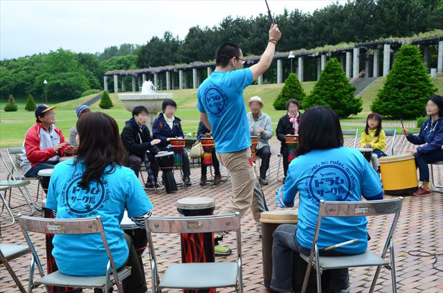 みんなで輪になってドンドコ太鼓をたたく「ドラムサークル」では、オトナもコドモも飛び入り参加してとっても盛り上がりました!