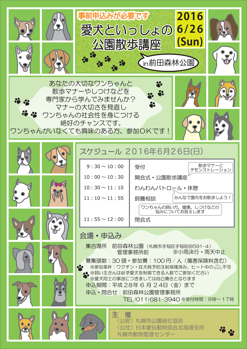6月26日(日)の10時から、前田森林公園にて「愛犬といっしょの公園散歩講座」を開催します。
