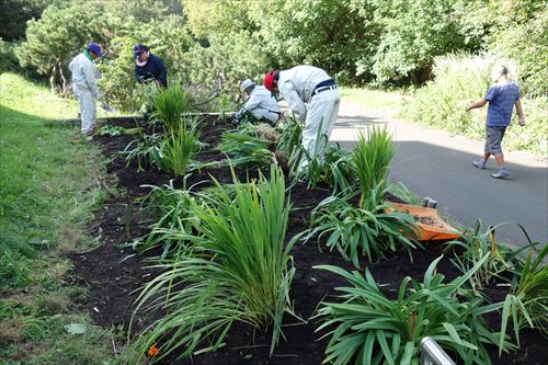 宿根草を植栽。アガパンサスとクロコスミアを植えました。蚊とたたかいながら、がんばった生徒たちのおかげで花壇が見違えるようになりましたね☆