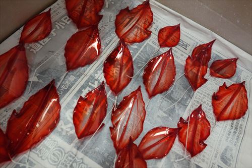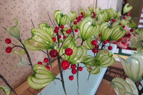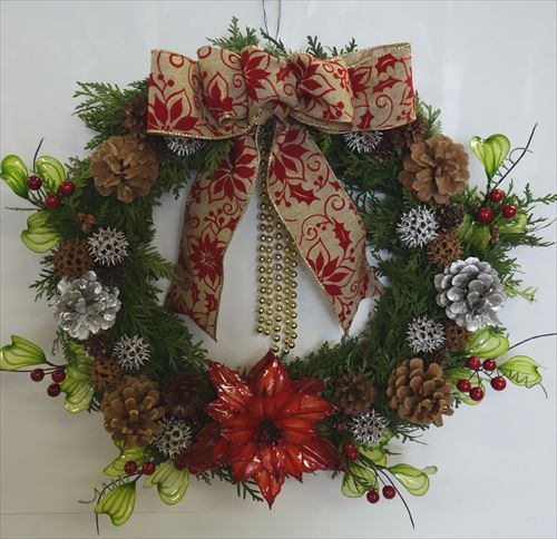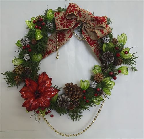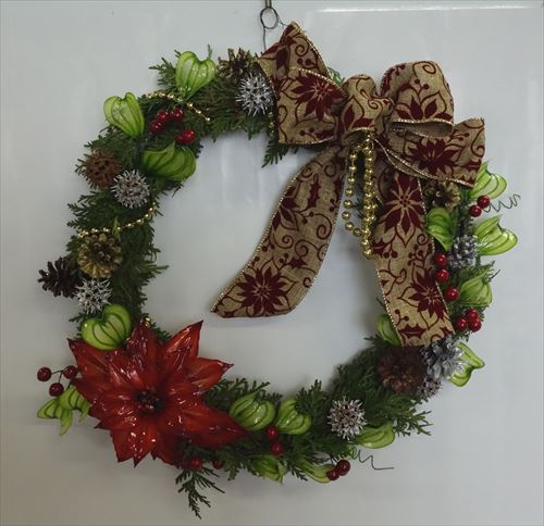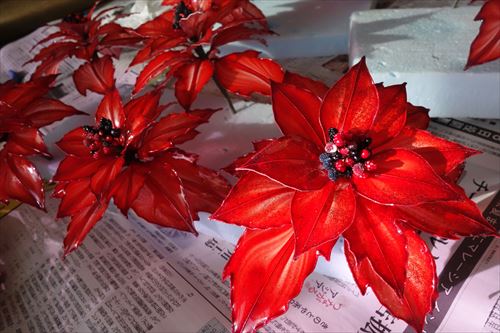 この鮮やかなポインセチアは、1つ1つのパーツをワイヤーで形づくり、液をつけて乾かし、組み合わせ、作り上げたものです。