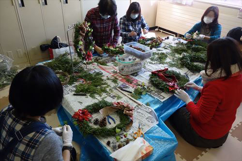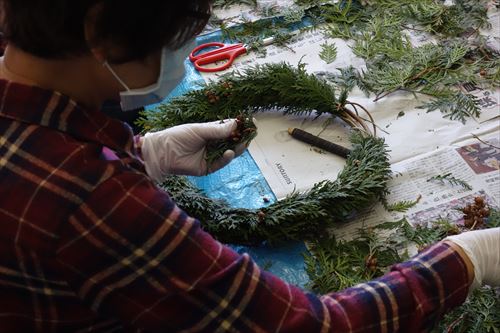 園内で採れた木の実やアメリカンフラワー、リボンを思い思いにつけていき