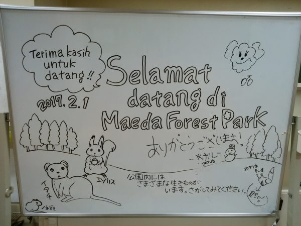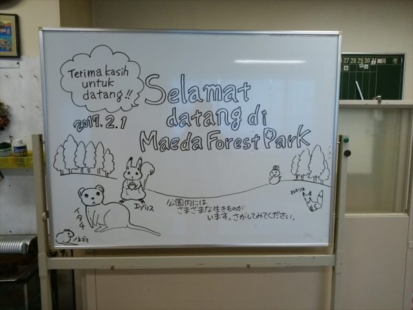 さて、当日少しでも歓迎の意を表したくて、控室にあるホワイトボードにこんな絵を描きました。