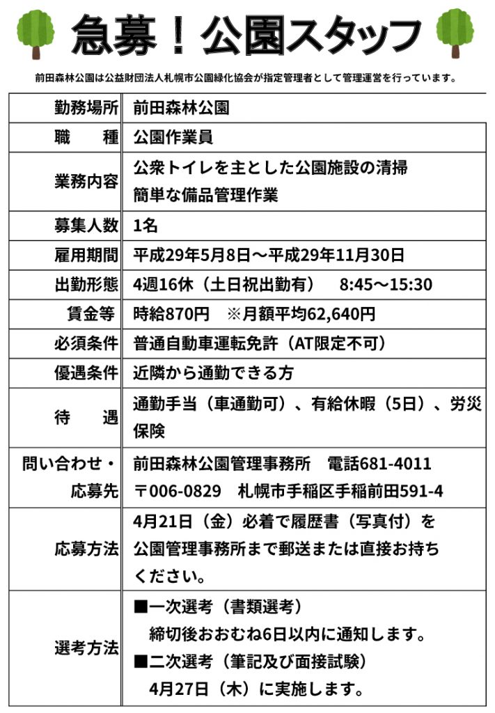 前田森林公園の普通作業員さんが急遽不足となり、1名募集することになりました。 急なことですので応募日時もあまりありませんが、何卒宜しくお願い申し上げます。