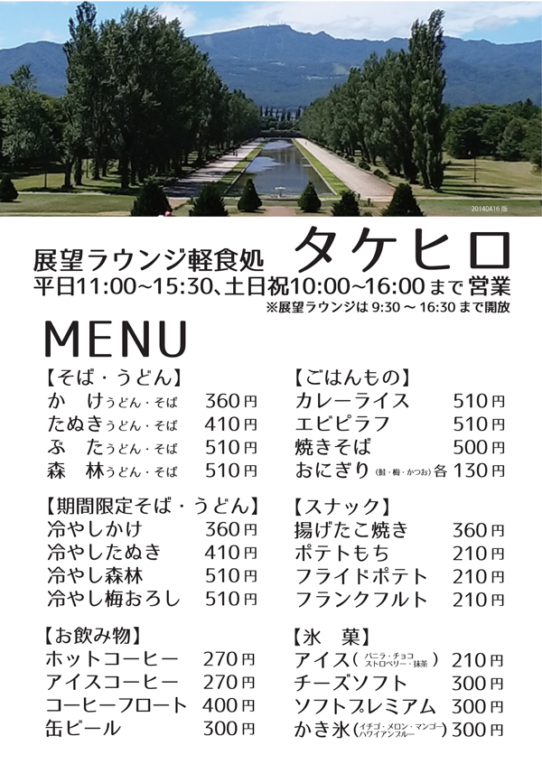展望ラウンジの軽食処「タケヒロ」も本日からオープン。うどんやおそばなどがありますのでご利用ください。