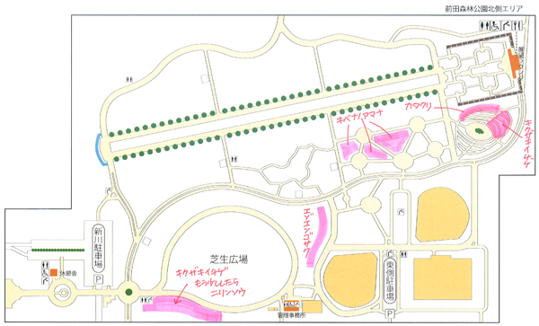 いずれも園内のそこかしこで見られる花ですが、ここなら絶対咲いているという場所をお知らせします。