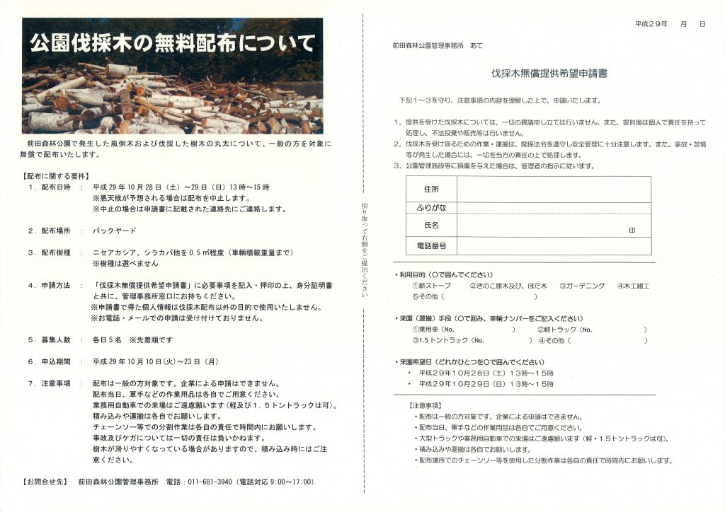 伐採木無償提供希望申請書は管理事務所横の休憩所にて配布しています。