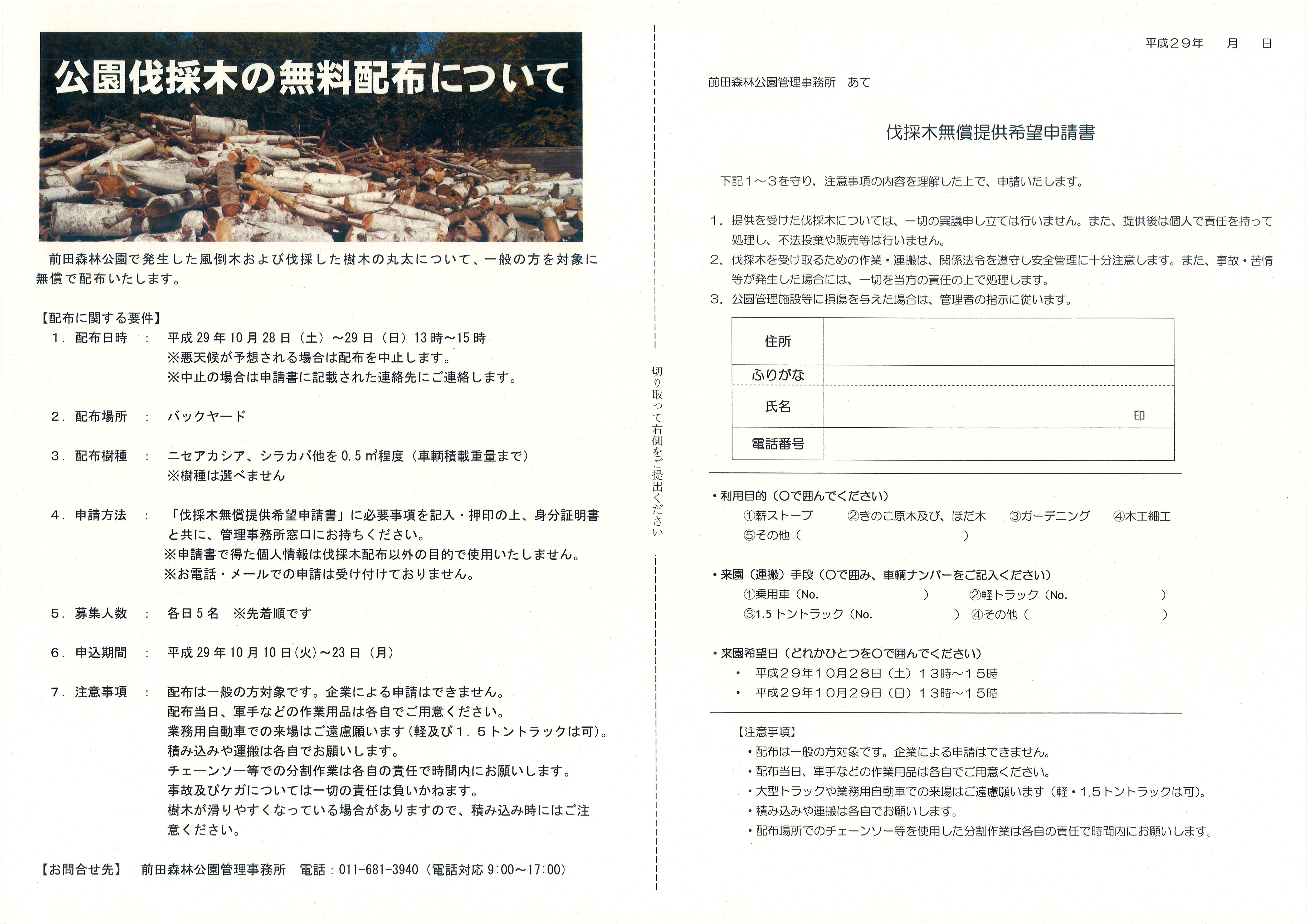 申請方法:「伐採木無償提供希望申請書」に必要事項を記入・押印のうえ、身分証明書と共に