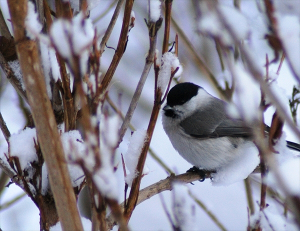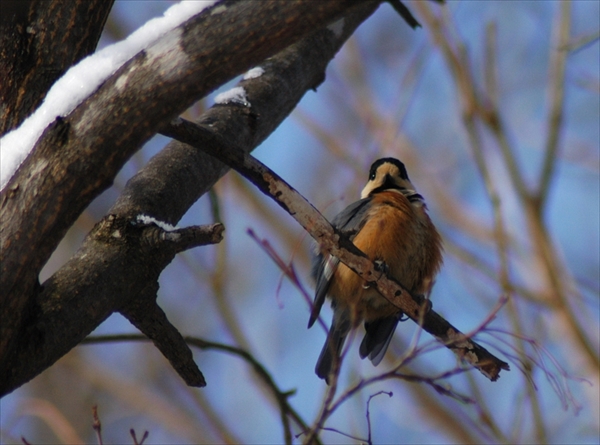 これはヤマガラ。おなかのオレンジ色が雪の中に映えるので、割とすぐに見つけられます。