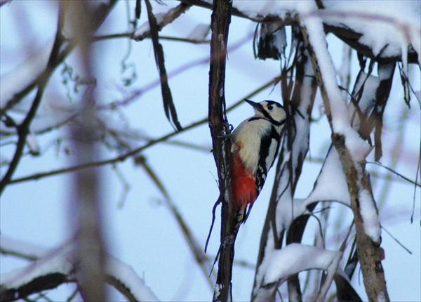 アカゲラたちもたくさん。これは頭の後ろが黒いのでメスの個体です。ヤマブドウのツルにしがみついて虫を探しているようです。