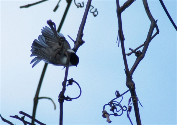 これは(多分)コガラ。こちらもヤマブドウのツルでエサ探し中。